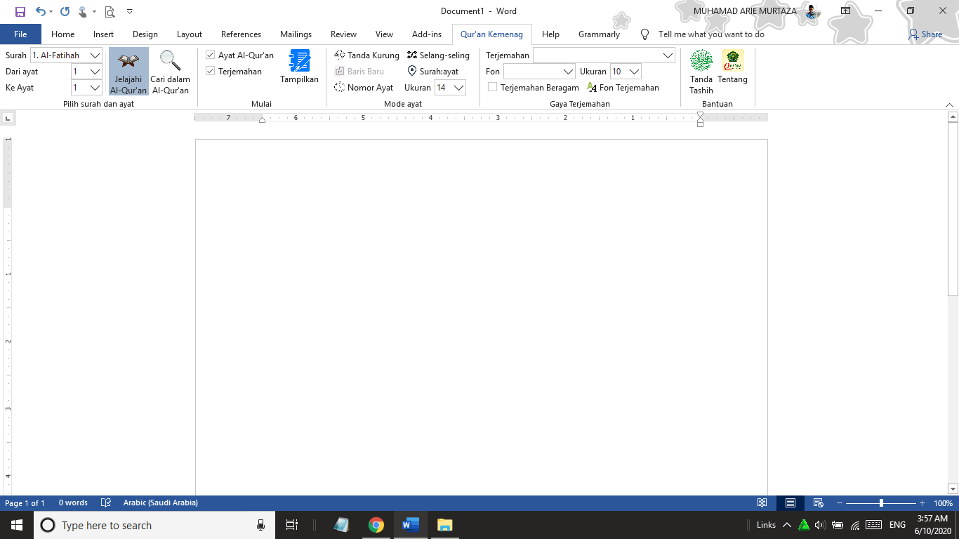 Nah, adapun Qur’an Kemenag in Ms Word yang dikembangkan oleh Mohamad Taufiq tampil dengan toolbar yang beragam dan menyatu dalam satu pita menu.