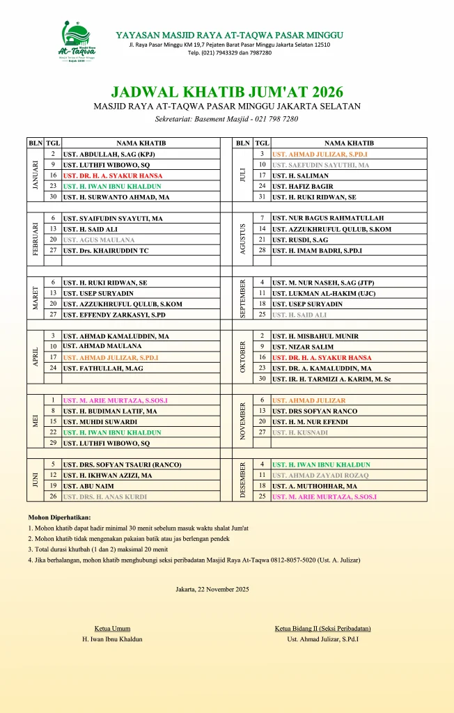 Masjid Raya At-Taqwa berupaya, baik dalam melayani umat dalam menunaikan ibadah fardhu maupun dalam memberikan pendidikan dan pelatihan yang sesuai dengan kebutuhan zaman.