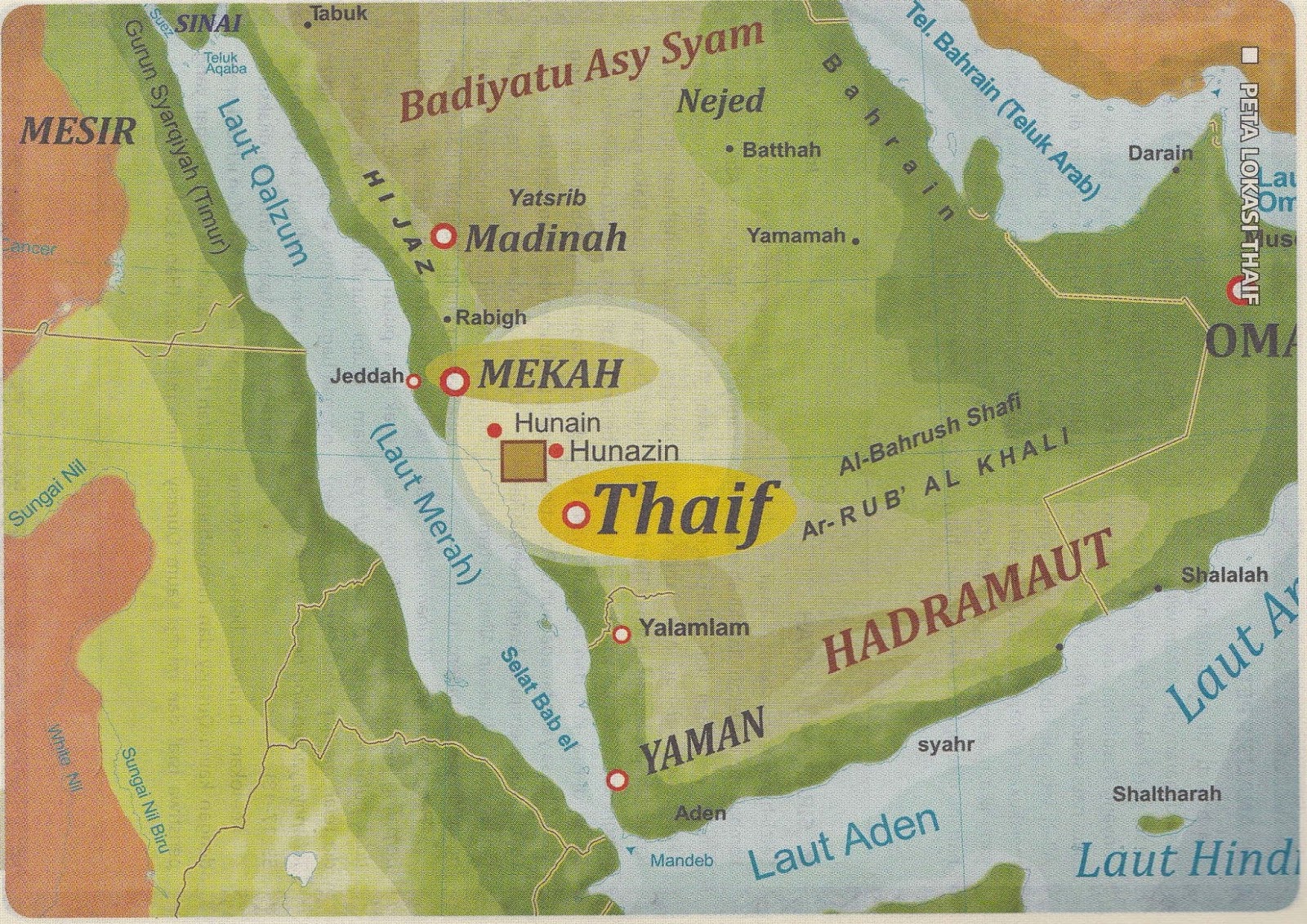 Lalu, Abrahah dan pasukan bergajahnya melanjutkan perjalanan. Setelah melewati beberapa malam, tibalah mereka di Tha’if, sebuah negeri subur yang terletak tidak jauh di selatan Makkah. Di negeri itulah berdiri berhala Arab yang terkenal, اللات, Al-Laat, sebuah sesembahan berbentuk batu yang diyakini sebagai anak perempuan Tuhan yang di Yunani disebut Athena dan di Romawi dipanggil Minerva. Penyembahan dewi Al-Laat ini merupakan hasil pergaulan dengan Bangsa Nabatea yang terjepit di antara Bangsa Mesir dan Bangsa Suriah yang keduanya merupakan bangsa penyembah berhala.