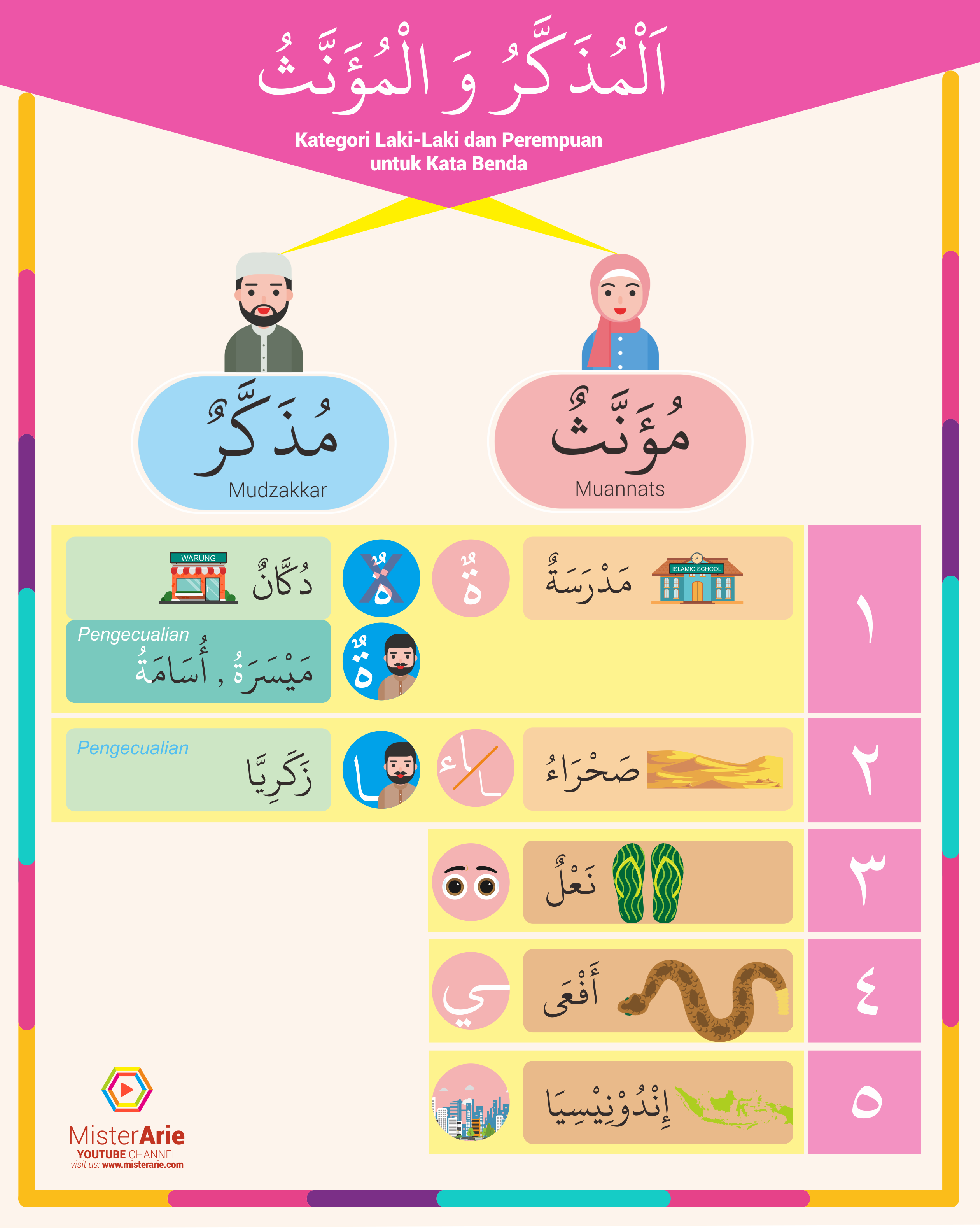 Adapun jika kamu ingin mempelajari mudzakkar dan mu’annats dalam bentuk video, yang pastinya lebih menarik, kamu bisa menonton video Mister Arie berikut:
